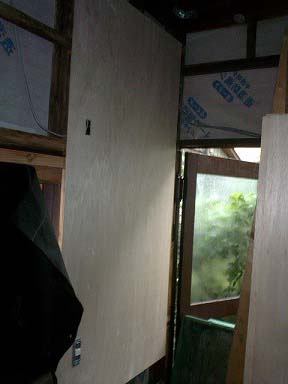 ぺたぺたと処理していきます。 ベニア板がけっこぉ大きいので2坪の小屋のなかで作業するのは、 けっこぉ至難の業。しかも板、厚いんですよね。6mmだっけか?